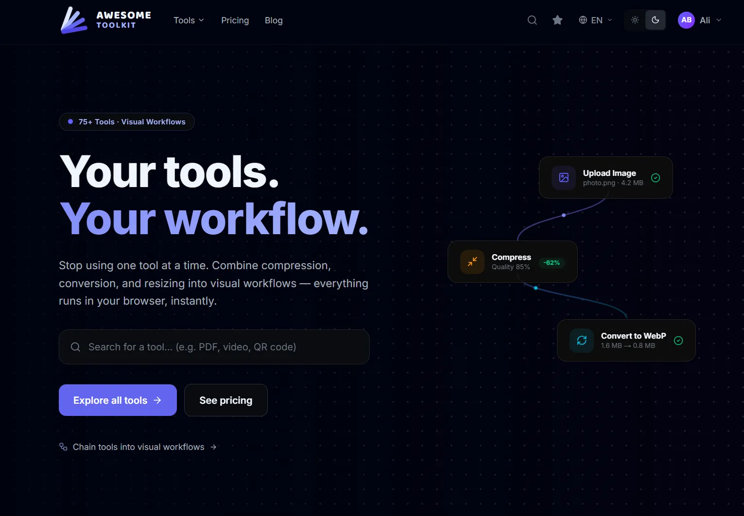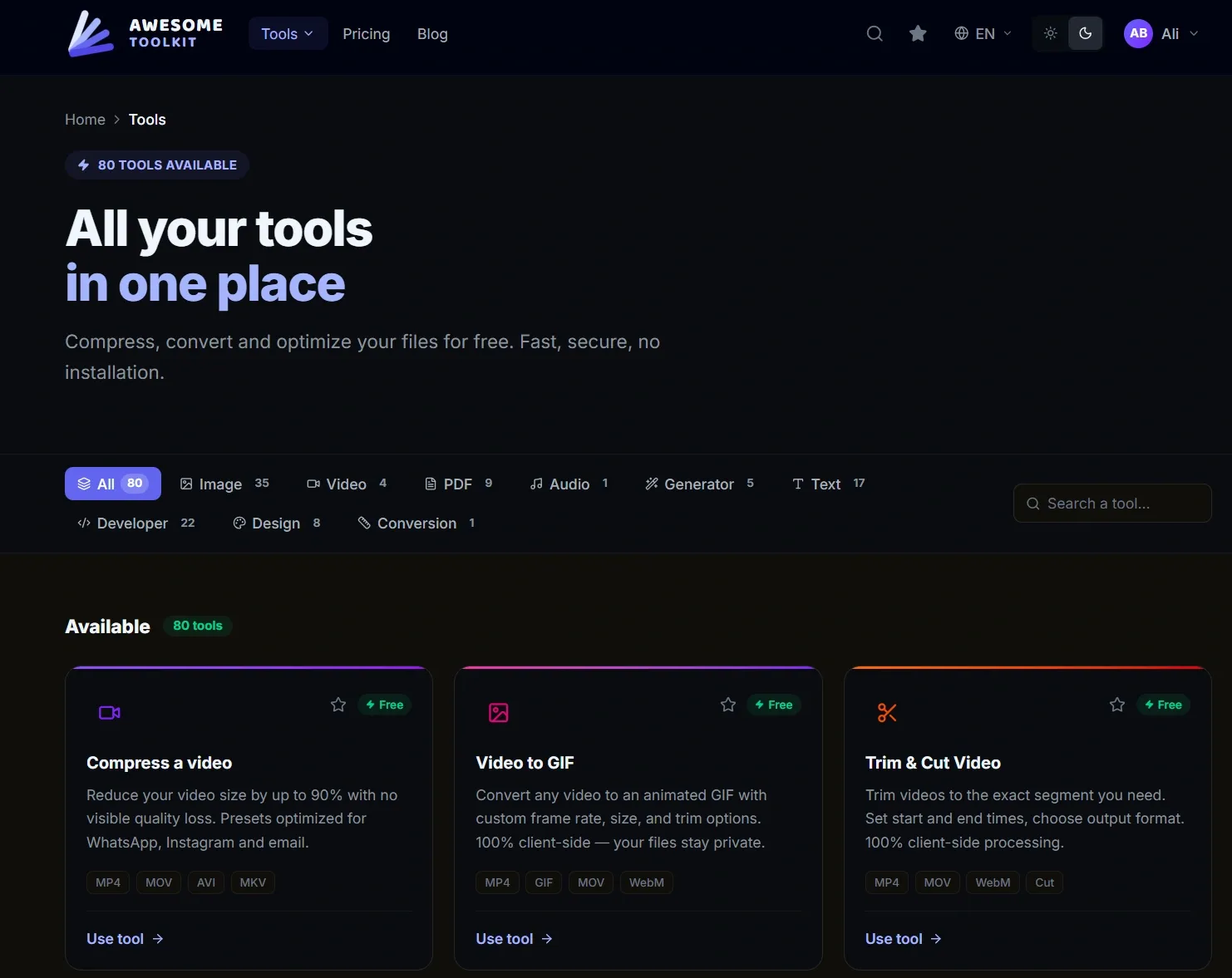Stop juggling 10 different online tools and uploading your files to random websites. Awesome Toolkit brings everything under one roof — and nothing ever leaves your browser. 75+ tools, zero uploads Images: convert (HEIC, PNG, WebP, SVG, ICO), compress, resize, crop, rotate, watermark, remove backgrounds, upscale with AI, generate social media formats in one click.