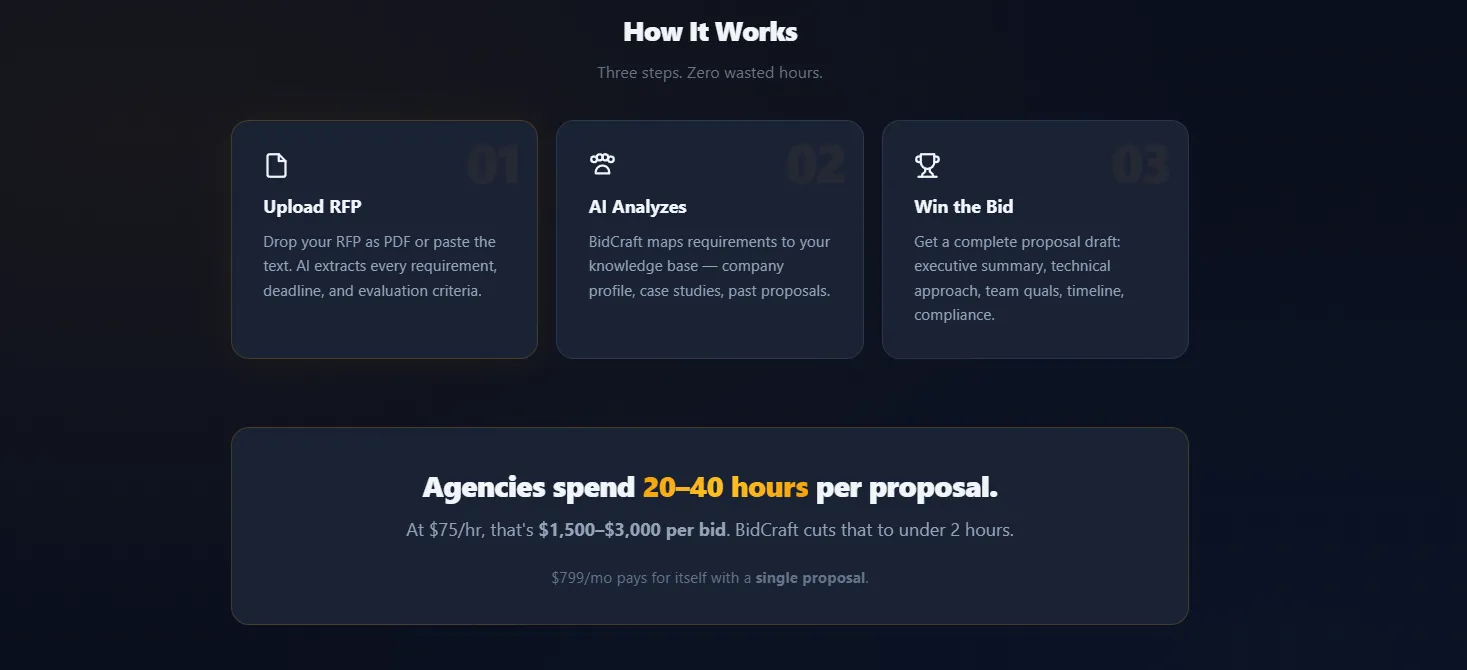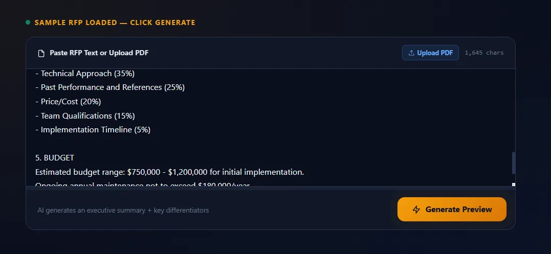 Win more bids 10x faster. An AI-powered proposal and RFP response generator that helps you create professional, high-quality proposals in minutes. Simply upload your RFP and let AI analyze requirements, generate structured drafts, and streamline your entire bidding process—so you can respond faster and win more contracts.