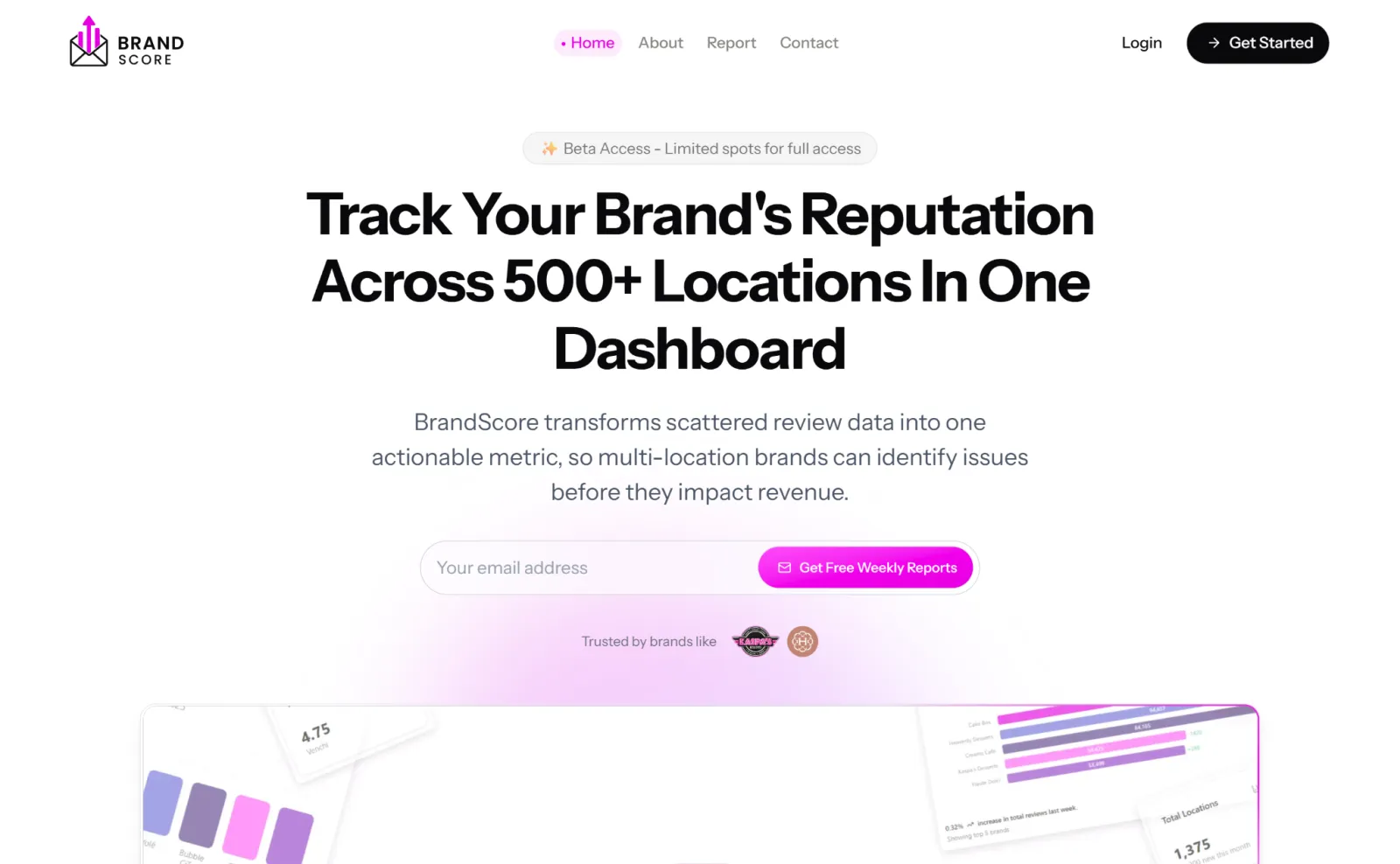 BrandScore is a reputation management platform built for multi-location brands. It automatically collects Google Maps ratings across all your locations, no API keys, no manual setup and transforms the data into a single, actionable BrandScore metric updated every week.