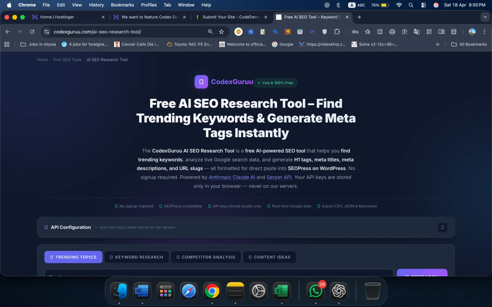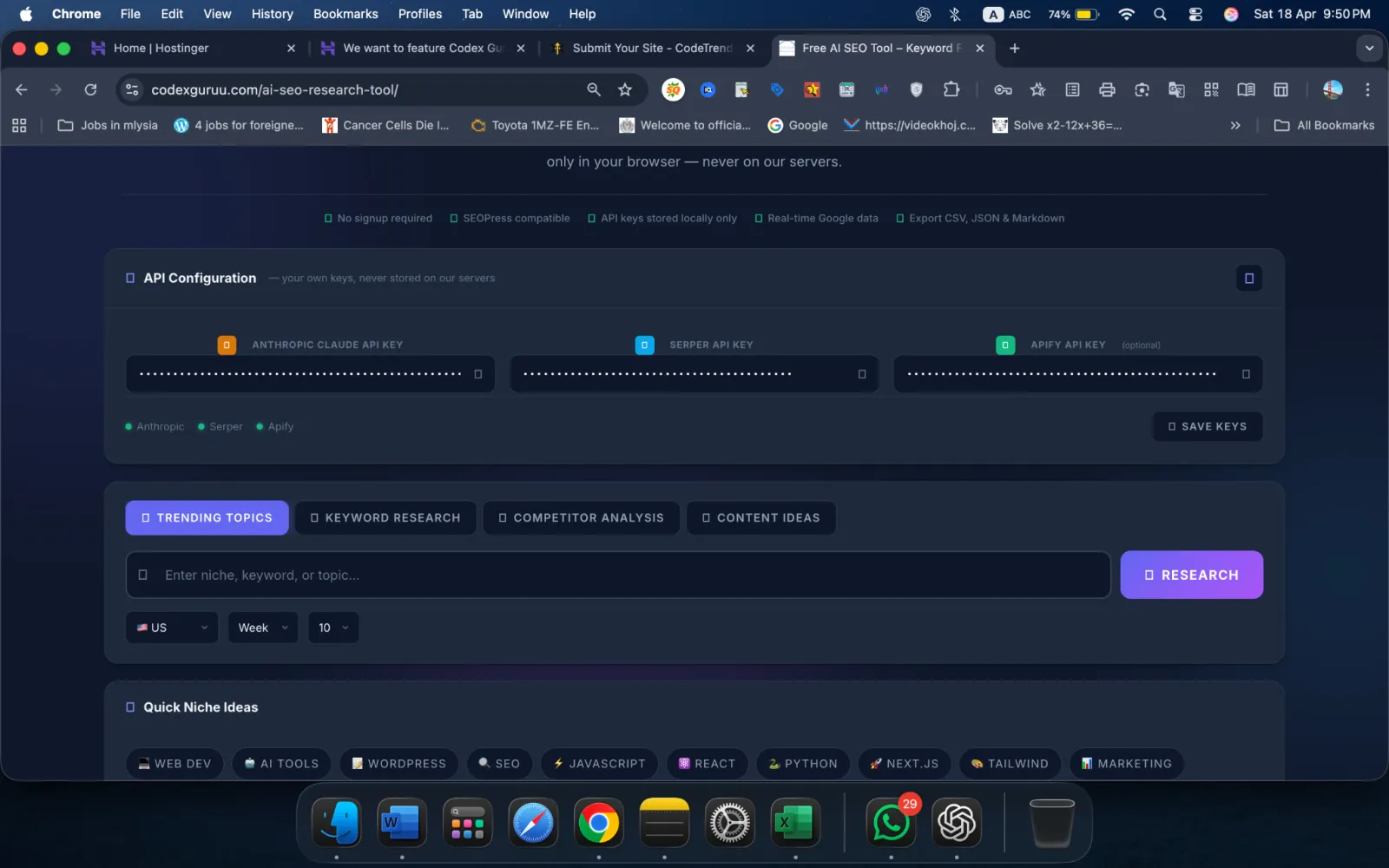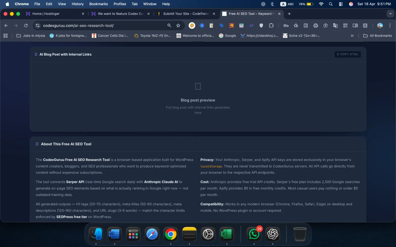 Privacy: Your Anthropic, Serper, and Apify API keys are stored exclusively in your browser's localStorage. They are never transmitted to CodexGuruu servers. All API calls go directly from your browser to the respective API endpoints. Cost: Anthropic provides free trial API credits. Serper's free plan includes 2,500 Google searches per month. Apify provides $5 in free monthly credits. Most casual users pay nothing or under $5 per month. Compatibility: Works in any modern browser (Chrome, Firefox, Safari, Edge) on desktop and mobile. No WordPress plugin or account required.
