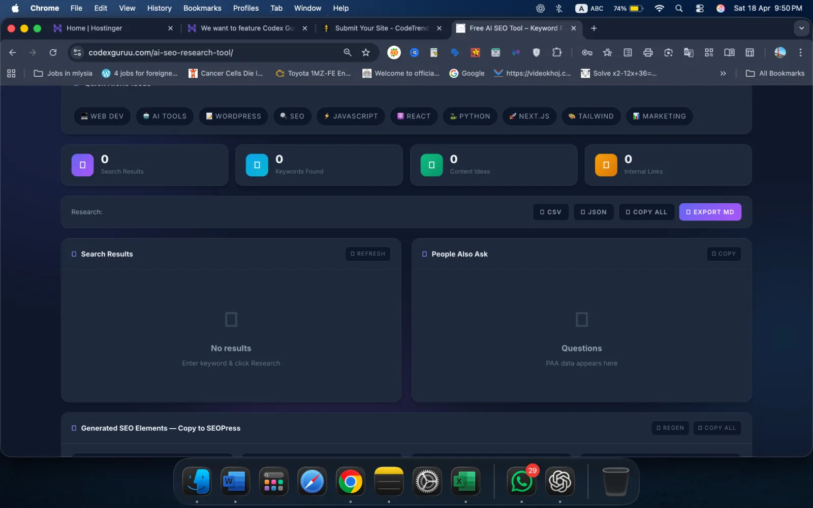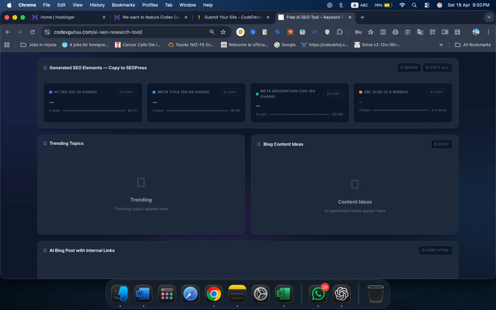 The CodeX Guru AI SEO Research Tool is a free AI-powered SEO tool that helps you find trending keywords, analyze live Google search data, and generate H1 tags, meta titles, meta descriptions, and URL slugs, all formatted for direct paste into SEOPress on WordPress.
