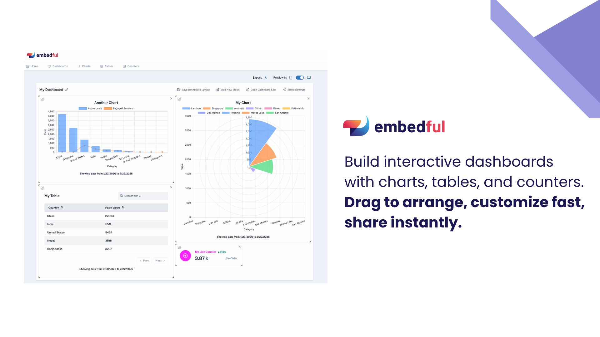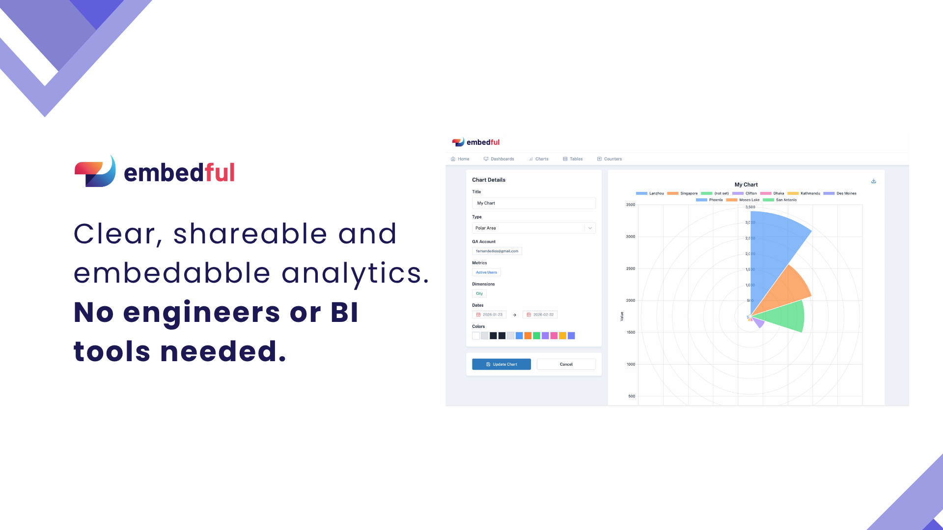 Embedful turns analytics into a feature your customers can see and interact with. Build charts, tables, counters, and dashboards in minutes using Google Analytics, Google Sheets, Excel, CSV files or APIs, and share them instantly. Visualizations are interactive by default, and branding can be tailored with your logo and theme colors. They can then be embedded or shared anywhere, making analytics simple and engaging for every user.