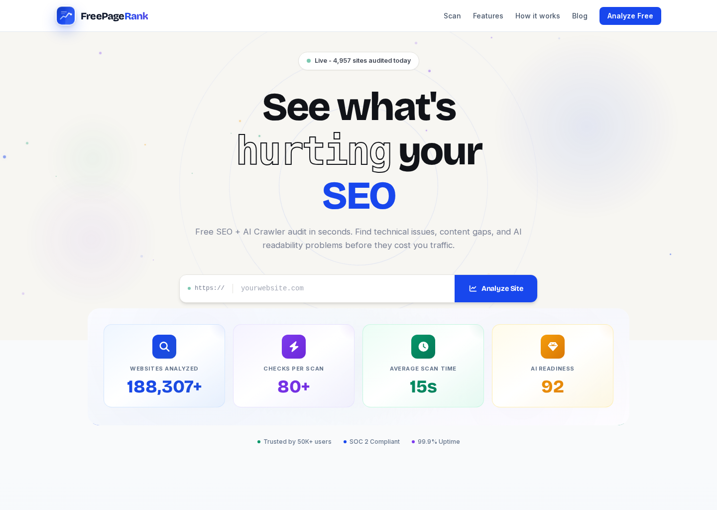 The AI Crawler Audit is something no other tool offers, free or paid. AI search is already here. Most sites are invisible to it and don't know it.