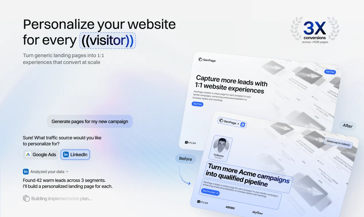 GenPage is an AI platform that generates personalized landing pages for every visitor intent. We help marketing and GTM teams create relevant website experiences at scale for every ad, keyword, or target account - converting more traffic into pipeline and revenue.