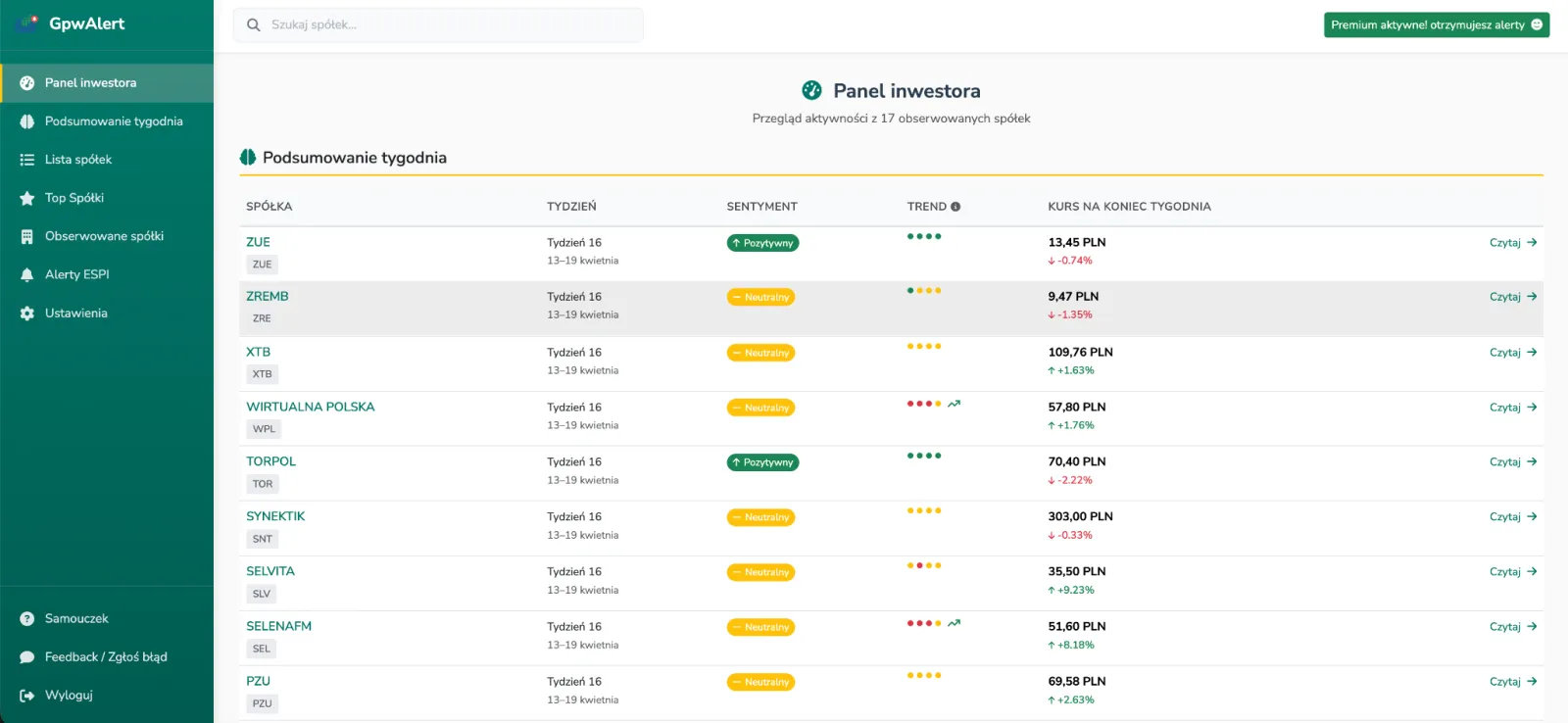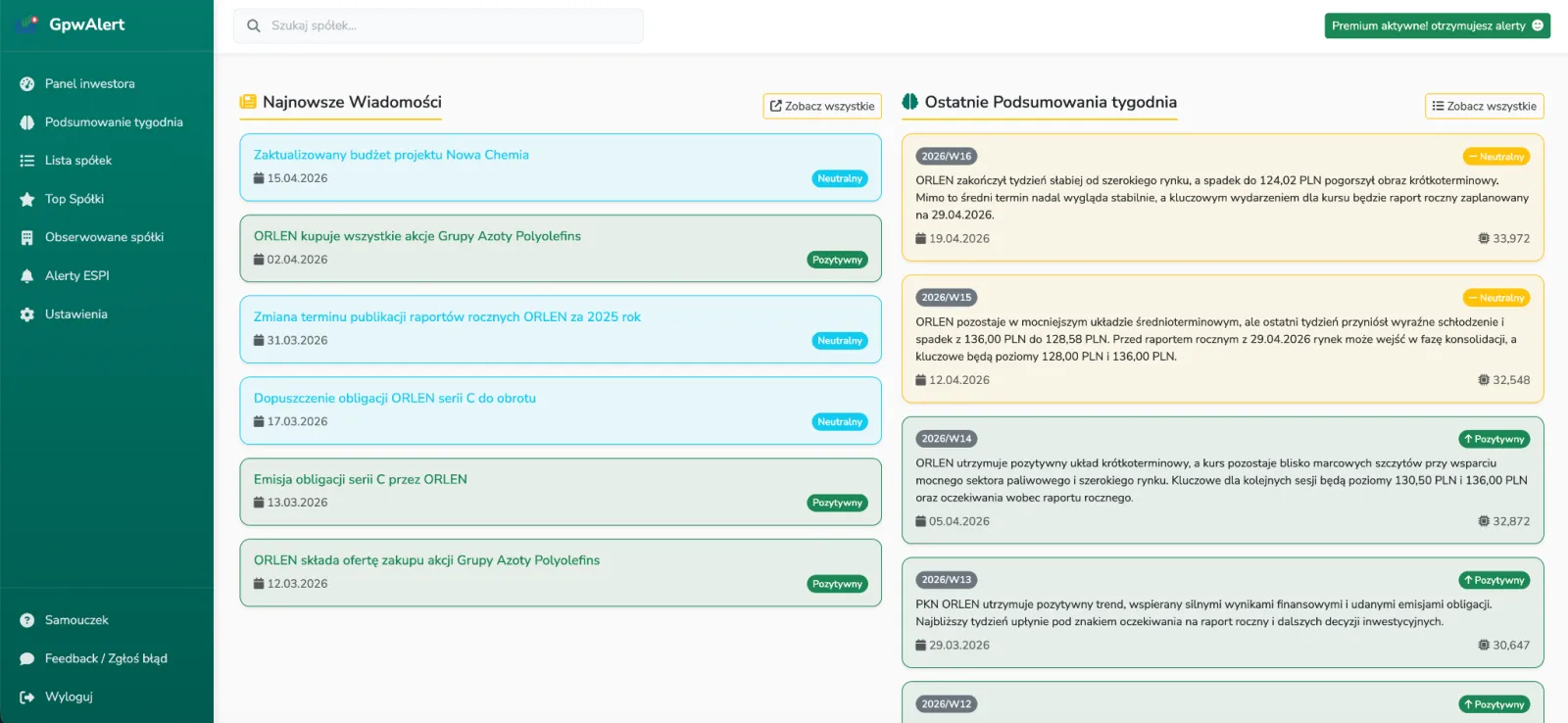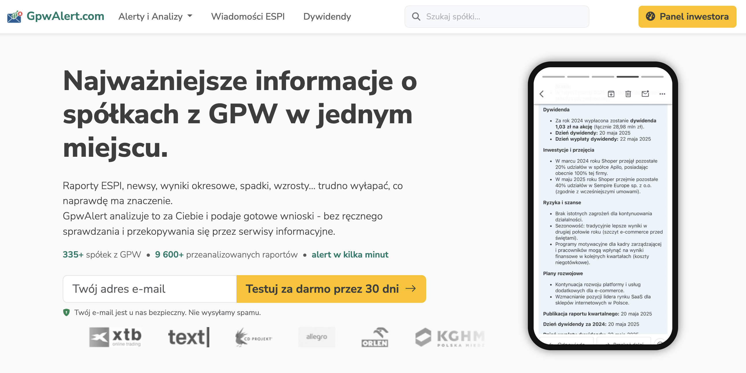 GpwAlert helps investors track companies listed on the Warsaw Stock Exchange without wasting time on reading long financial reports and scattered information. The platform automatically monitors 335+ companies, processes thousands of official company announcements, financial reports, and market updates , and delivers clear insights via email within minutes. What it does: Instant alerts –...