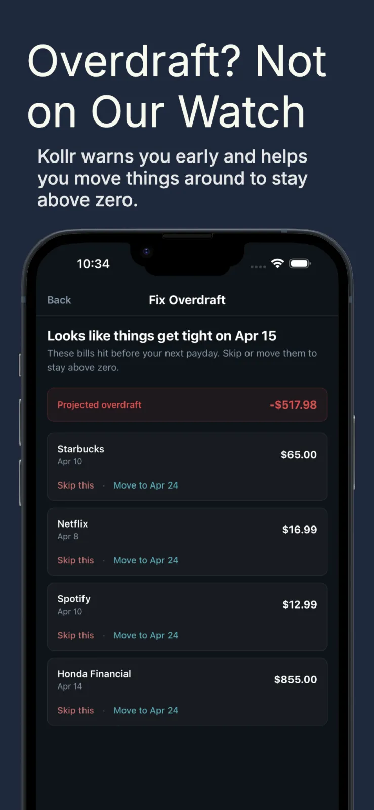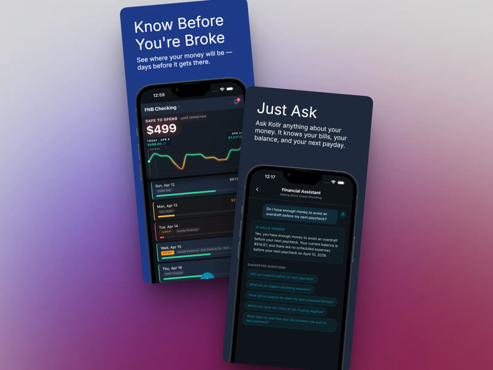Most people don't budget — and they shouldn't have to. Kollr is built for the paycheck-to-paycheck reality: you need to know if you're going to make it, not track every latte.