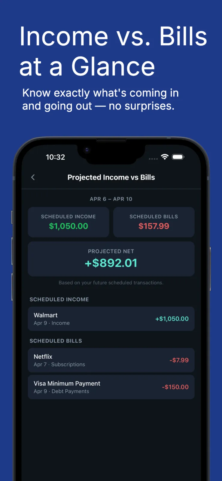 No bank linking required. No financial jargon. No guilt about not having a "real budget." Just a simple, honest forecast of what's coming.