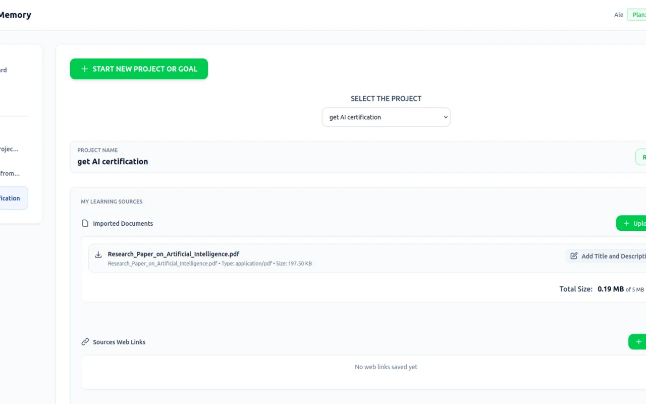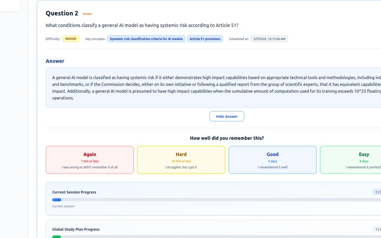 Memoryze any subject with AI generated question-answer pairs generation and spaced repetition system. Upload your own documents or indicate the web links where to get the study material, generate personalized study plans, and retain knowledge long-term thanks to Active Recall techniques.