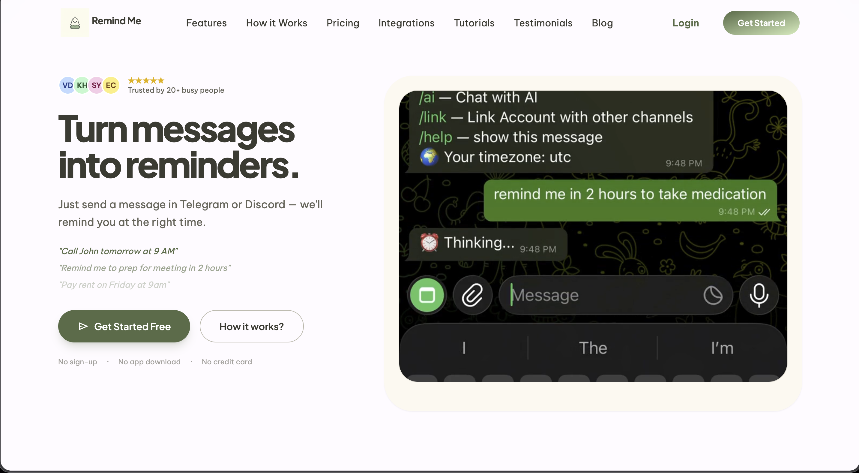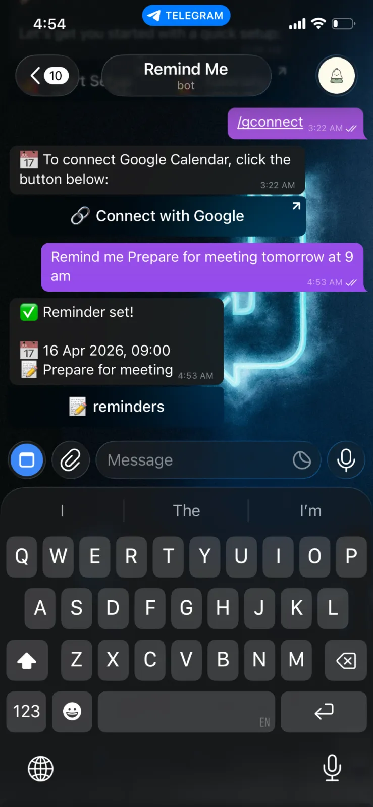 Remind Me Bot lets you set reminders on Telegram the way you'd tell a friend. Just type: "remind me in 2 hours call John" "remind me next Monday at 10am submit report" No forms. No date pickers. No app to download. Features: 1. Natural language parsing 2. Recurring reminders 3. Voice reminders - send a voice message, it transcribes and sets the reminder 4. Notes & files - attach a note or files...