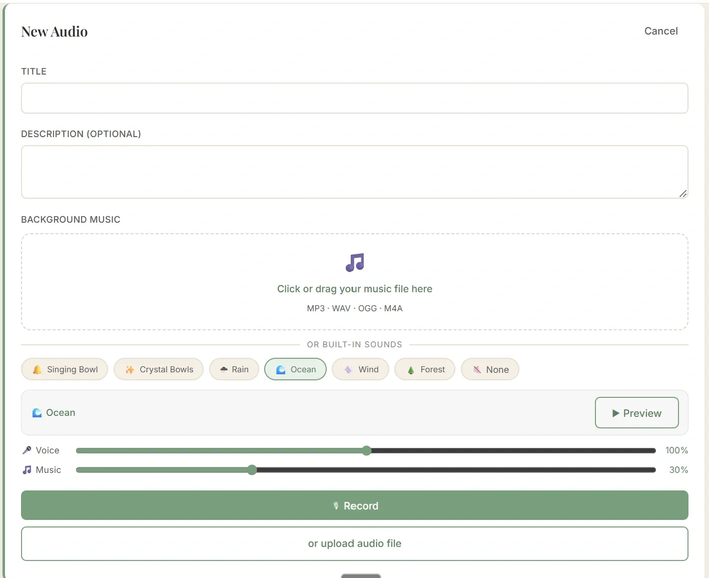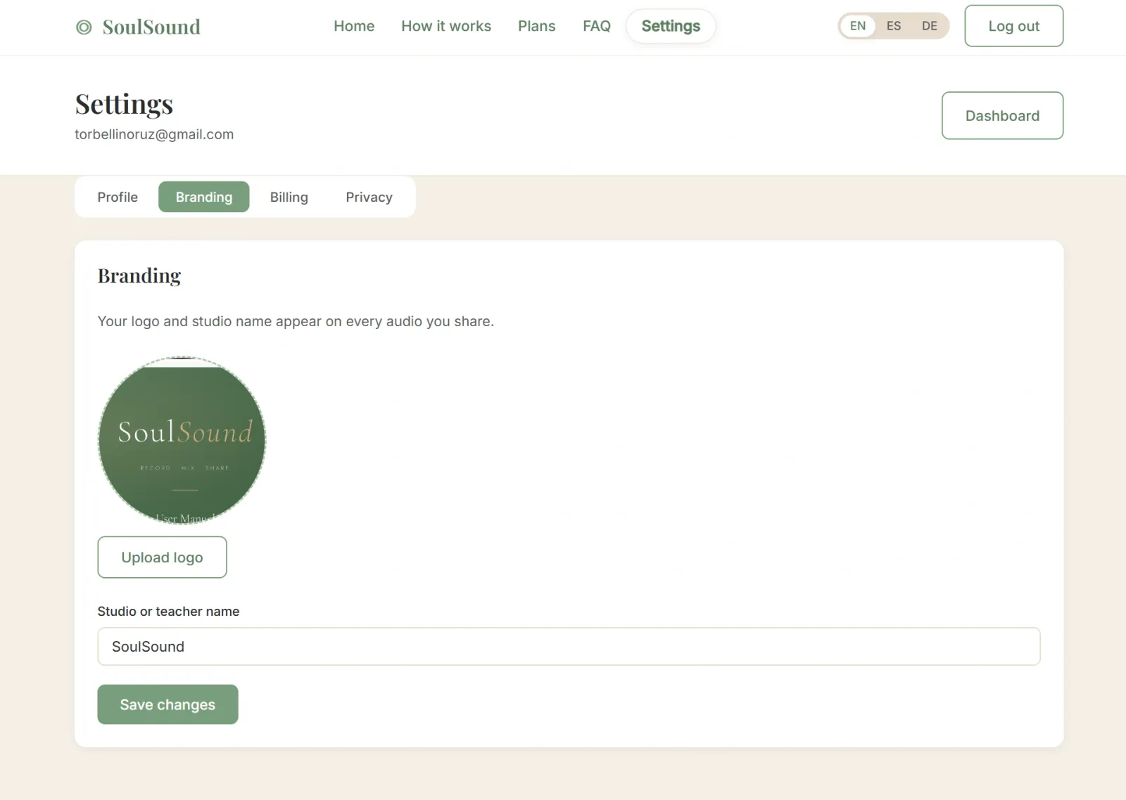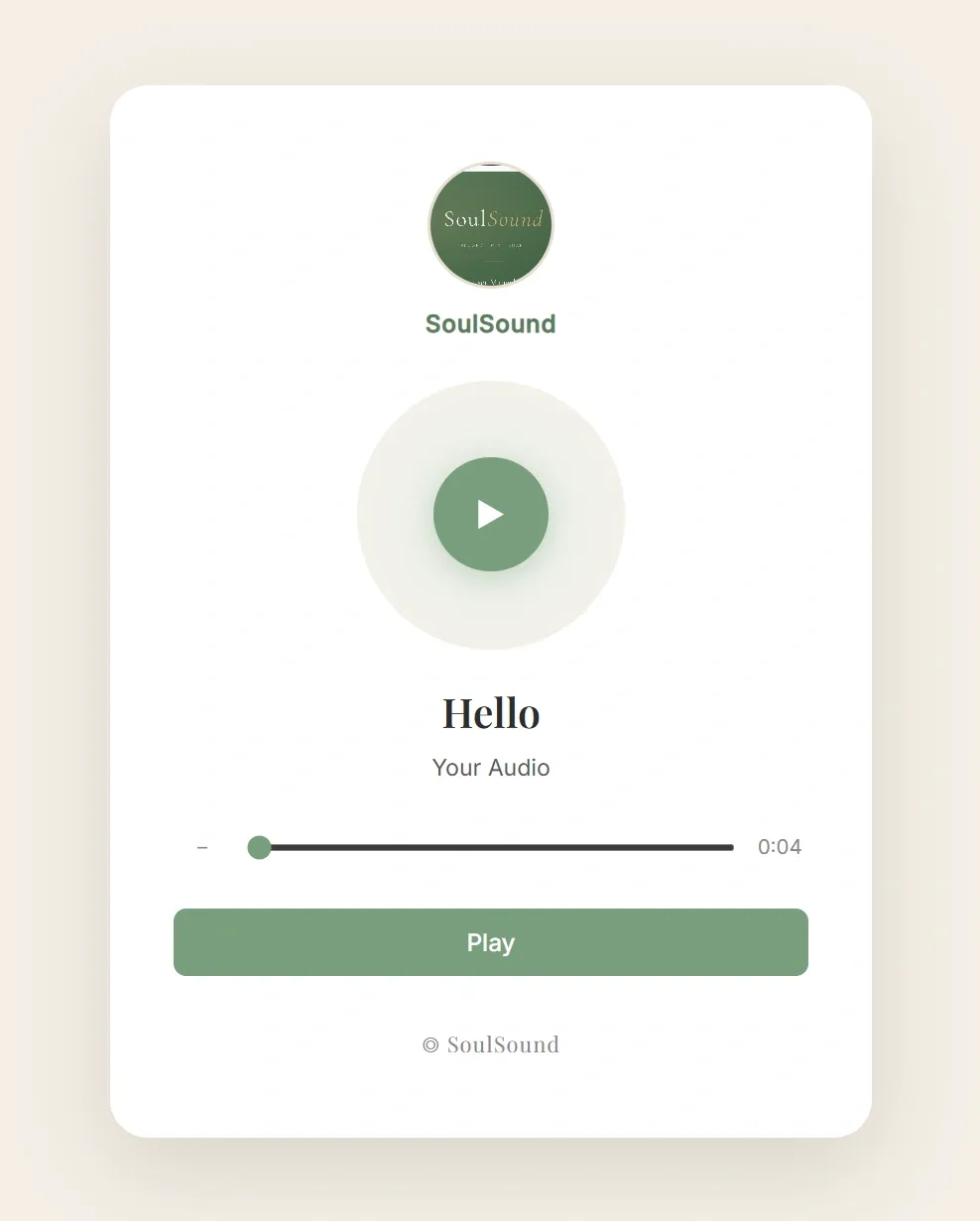 SoulSound is a platform for psychologists, psychiatrists, therapists, hypnotherapists, meditation teachers, yoga instructors, life coaches and storytellers to record, personalize and share professional audio content — no technical skills needed. Unlimited recordings, background music mixer, personal branding on every audio, easy sharing via WhatsApp & email. Multilingual (EN/DE/ES).
