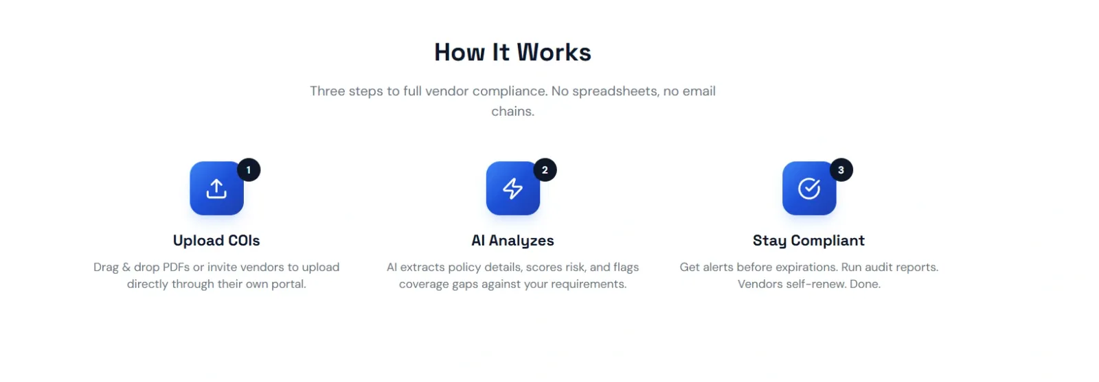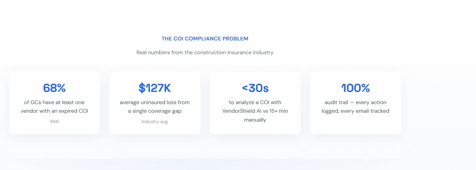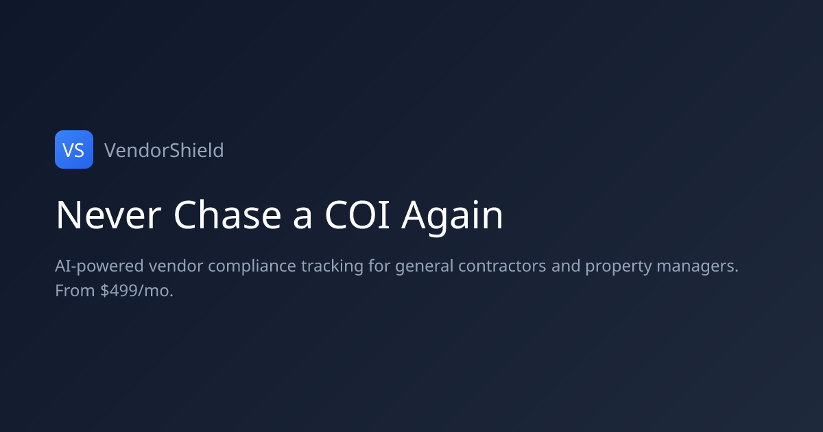 Upload certificates of insurance (COIs) and VendorShield automatically verifies coverage, flags gaps, tracks expirations, and scores vendor risk. Built for construction and real estate contractors who manage dozens of subcontractors. AI reads any COI PDF instantly.