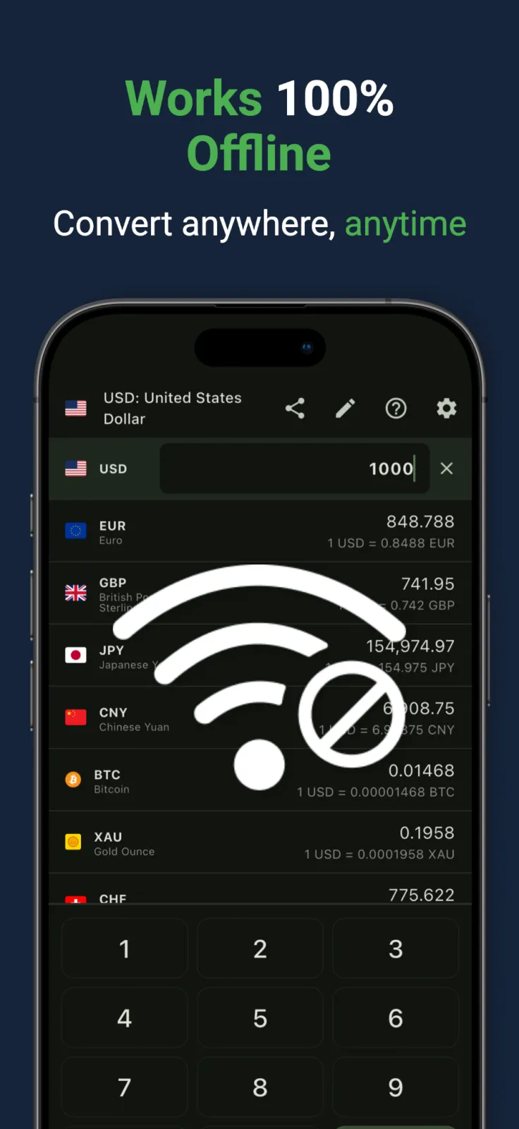 Exchange rates are cached locally so you can convert currencies anywhere — on airplanes, in remote areas, or when roaming. Perfect for international travelers who need reliable conversions without internet access.