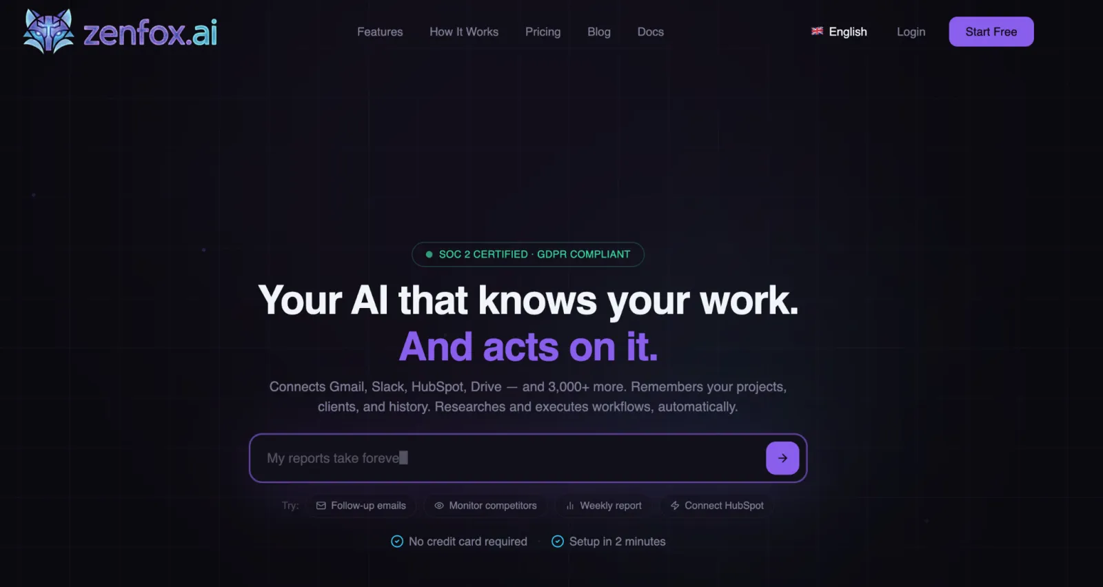 Zenfox is an AI assistant designed for action. Unlike chatbots that only answer questions, Zenfox connects to your existing tools — Gmail, Calendar, Slack, Notion, GitHub, HubSpot, and 3000+ others — to actually execute tasks. You can create a dedicated AI Employee that will work 24/7 on a specific task or project and will report when needed only.